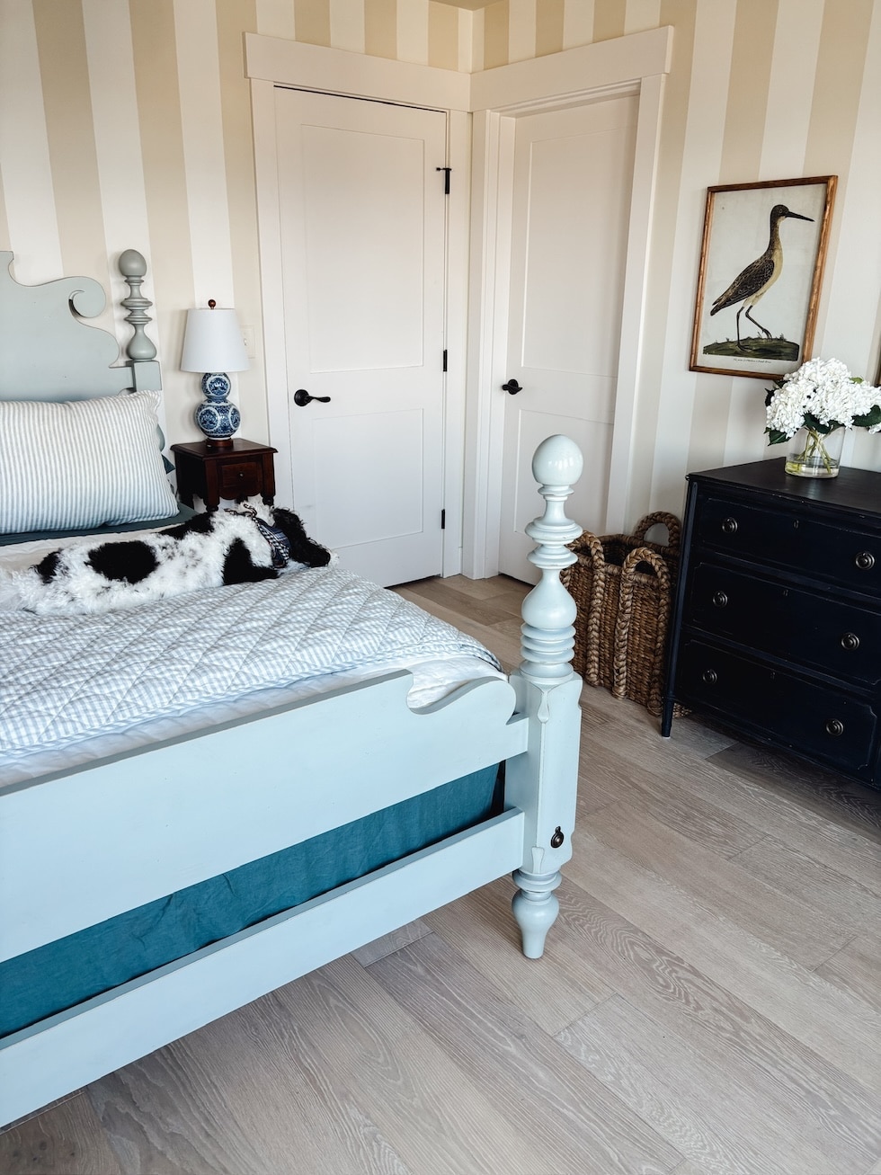 First, we wanted our Facebook marketplace find, our Robin’s Egg Blue Ethan Allen Quincy Bed, to not get lost in the color palette. We wanted it to feel special, like the focal point of the room. Every blue we liked in this room looked exactly like the bed haha, so we couldn’t find another one we loved enough.
