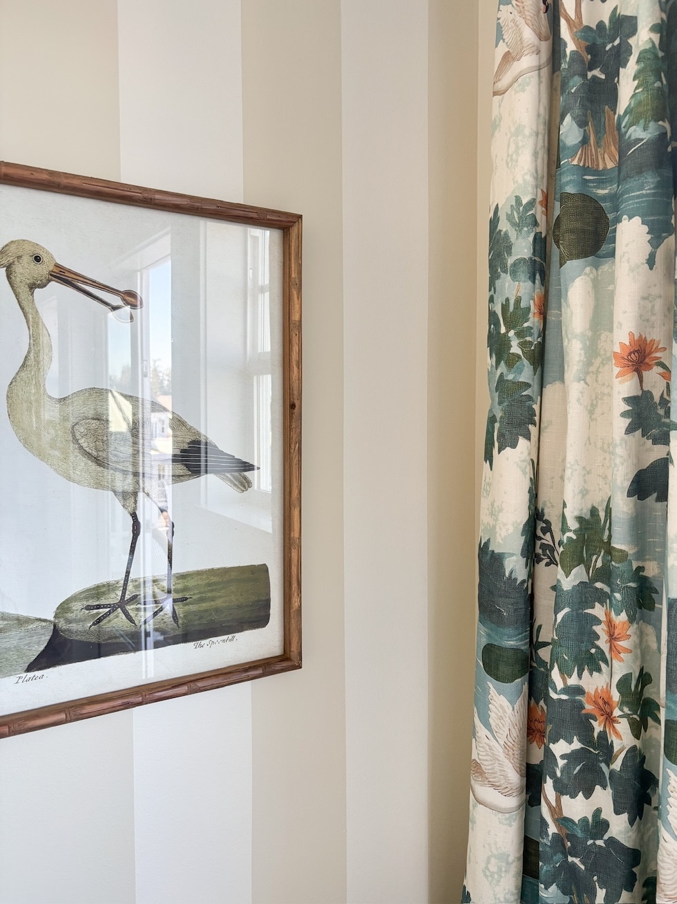 The new curtain panels bring the palette together and give it such a fresh “island” vibe– and they have swans on them!– we just love the whole mood they bring. We’ve chosen to only use one panel on each side, so with the configuration of our windows they read as cohesive pairs without overwhelming the space. They are functional, too!