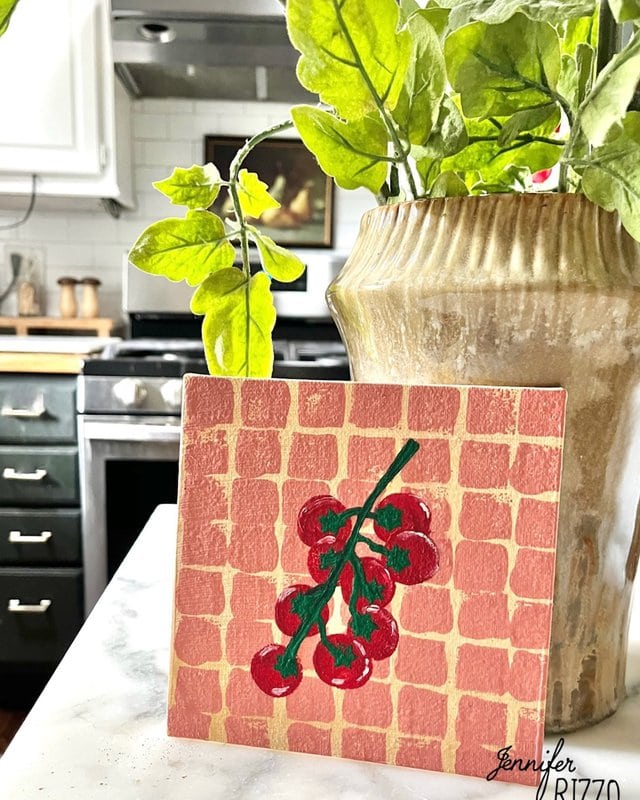 It was fun to paint these in two different colorways. I used a slightly smaller round foam stamper for the painting with the pink background. It made it feel more like a cluster of cherry tomatoes. Adding some “underneath” the stem also made it feel a little more realistic. This is a really fun and easy project that doesn’t require any kind of artistic skills at all, just the willingness to Paint a Cute Cherry Tomato Bunch in Acrylic Paint and give it a go!