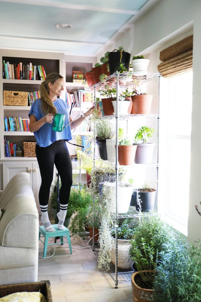 {I once stored them all on the floor and they died, so this keeps them much more manageable + protects our little potted garden- some are affiliate links.} Shelf {I may add another next fall – I can break it down and store it away in the spring} /