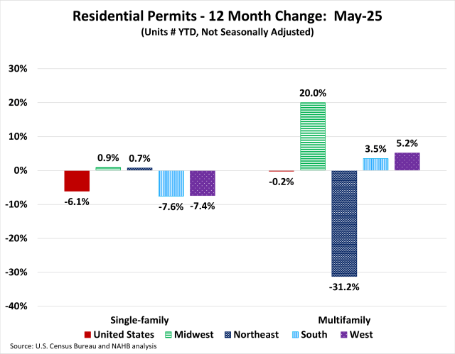 Year-to-date ending in May, single-family permits were up in two out of the four regions. The Midwest and the Northeast posted small increases of 0.9% and 0.7% respectively. The South was down by 7.6% and the West was down by 7.4% in single-family permits during this time. For multifamily permits, three out of the four regions posted increases. The Midwest was up by 20.0%, the West was up by 5.2%, and the South was up by 3.5%, Meanwhile, the Northeast declined steeply by 31.2%, driven by the New York-Newark-Jersey City, NY-NJ MSA which declined by 42.0%.
