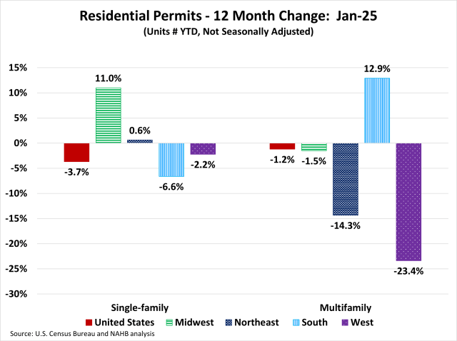 Year-to-date ending in January, single-family permits were up in the Midwest (+11.0%) and the Northeast (+0.6%) but down in the two remaining regions. The West was down by 2.2% and the South was down by 6.6% in single-family permits during this time. For multifamily permits, three out of the four regions posted declines. The South was up by 12.9% but the West posted a decline of 23.4%, the Northeast declined by 14.3%, and the Midwest declined by 1.5%.