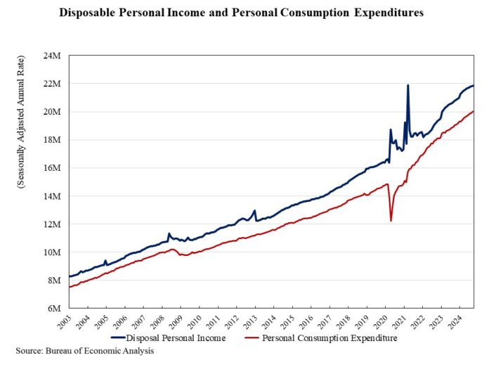 Personal income increased by 0.3% in September, following a 0.2% up in August and a 0.3% increase in July, according to the most recent data release from the Bureau of Economic Analysis. The gains in personal income were largely driven by increases in wages, salaries, and personal current transfer receipts. However, the pace of personal income growth slowed from a peak monthly gain of 1.4% seen in January 2024.