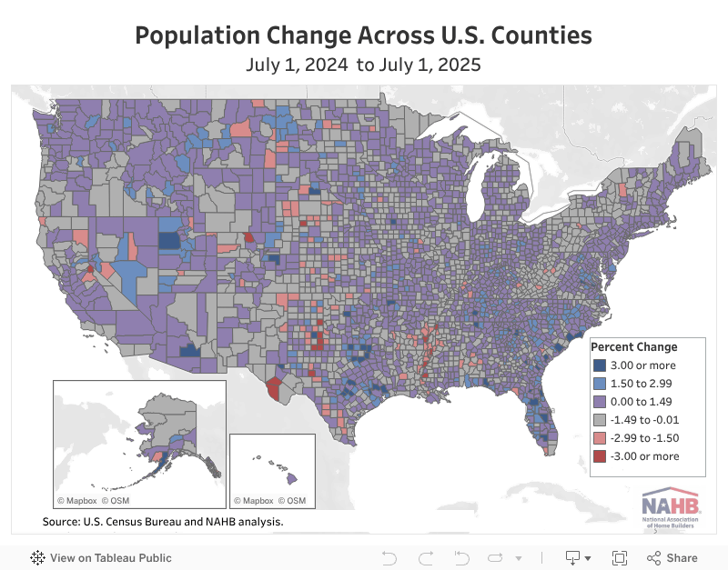 Conversely, counties with stagnant or declining populations are contributing to a softer national housing outlook. Builders in these markets are facing slower absorption, rising inventories, and a more cautious development environment, all of which are reflected in softer HBGI readings.