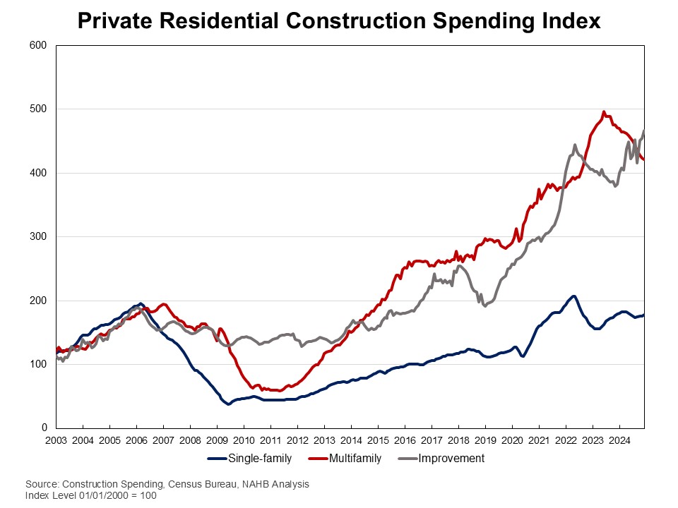The monthly increase in total private construction spending was primarily driven by higher spending on single-family construction and residential improvements. Single-family construction spending was up 1% for the month. This marks a continuation of growth after a five-month decline from April to August, aligning with steady builder confidence seen in the Housing Market Index. However, single-family construction remained 0.8% lower than a year ago. Improvement spending rose by 2.6% in December and was 21.9% higher compared to the same period last year. In contrast, multifamily construction spending edged down 0.3% in December, following an 8.4% increase in October and a 0.8% up in November. Compared to a year ago, multifamily construction spending was still 10.5% lower.