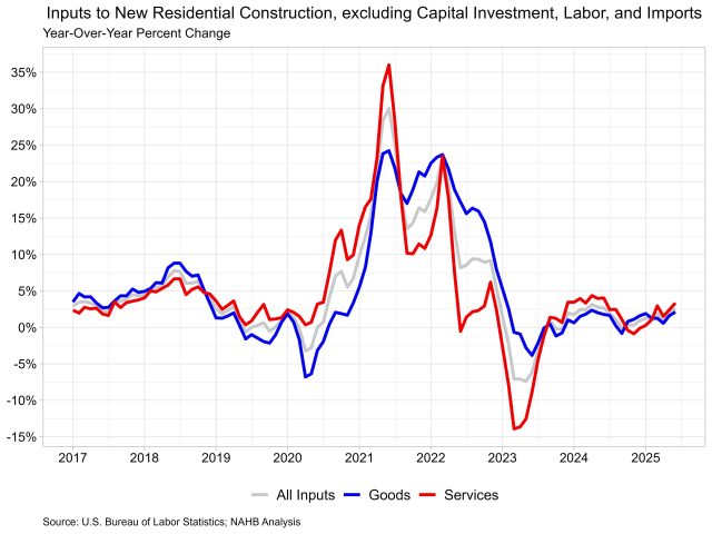The latest available data, for April 2025, showed that domestically produced goods have experienced faster price growth compared to imported goods used in new construction. On a year-over-year basis, the index for domestic goods increased 0.4%, while prices for imported goods fell 0.1% over the same period. Comparatively, service prices have risen more than good prices over the past year, rising 3.1% year-over-year. Across the three indexes, all inputs remain at higher levels compared to pre-pandemic prices.