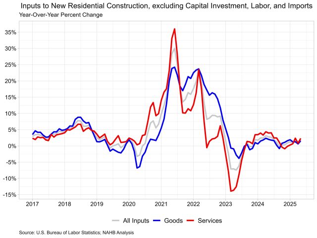 The goods component has a larger importance to the total residential construction inputs price index, representing around 60%. For the month, the price of input goods to new residential construction was up 0.1% in May.