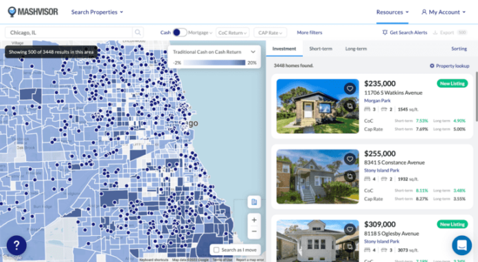 Mashvisor’s heatmap analysis tool gives a quick overview on which parts of a city are likely to have the best investment property.