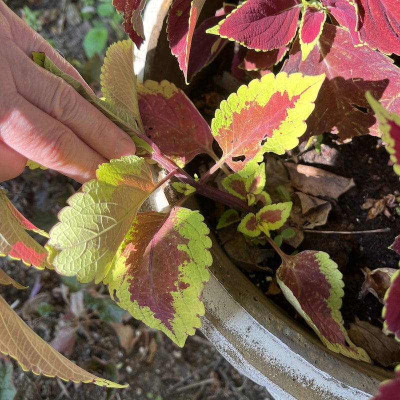 Normally in the beginning of the season, I buy some really beautiful large varieties, put them in the ground and start propagating and planting. Normally, just before the first frost hits, I take cuttings to overwinter my Coleus.