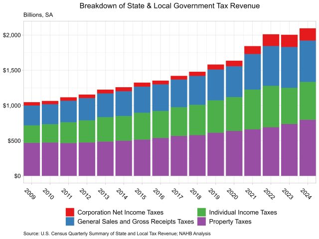 According to the Census Bureau’s Quarterly Summary of State and Local Taxes, state and local property tax revenue totaled $797.0 billion (38.0%), up 8.2% from the prior year. Individual income tax totaled $537.4 billion (25.6%), up 4.7% over the year. Corporate income tax totaled $174.5 billion (8.3%), up 0.2% and general sales tax revenue was up 1.2% to $587.0 billion (28.0%) in 2024.