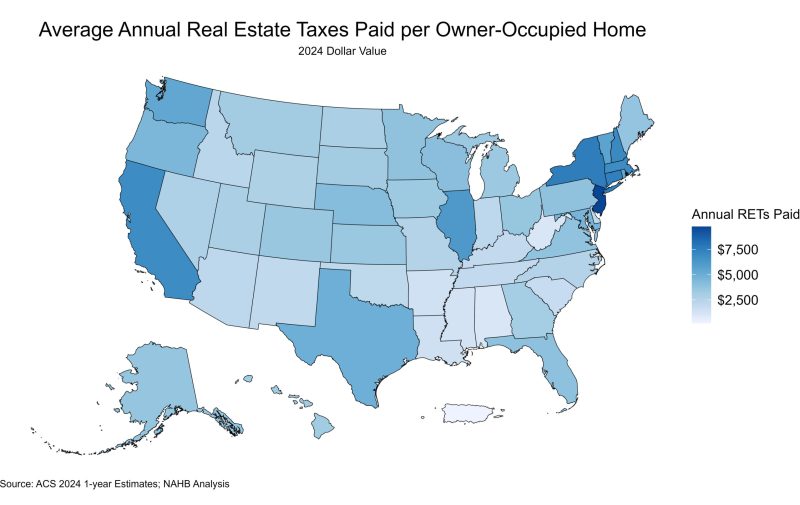Nationally, across the 87 million owner-occupied homes in the U.S., the average amount of annual real estate taxes paid in 2024 was $4,271, according to NAHB analysis of the 2024 American Community Survey. Homeowners in New Jersey continued to pay the highest real estate taxes, paying an average of $9,767, $2,194 more than the next closest state, New York, at $7,573. On the other end of the distribution, homeowners in West Virginia paid the lowest average amount of real estate taxes at $1,044. The map below shows the geographic variation of average annual real estate taxes (RETs) paid.