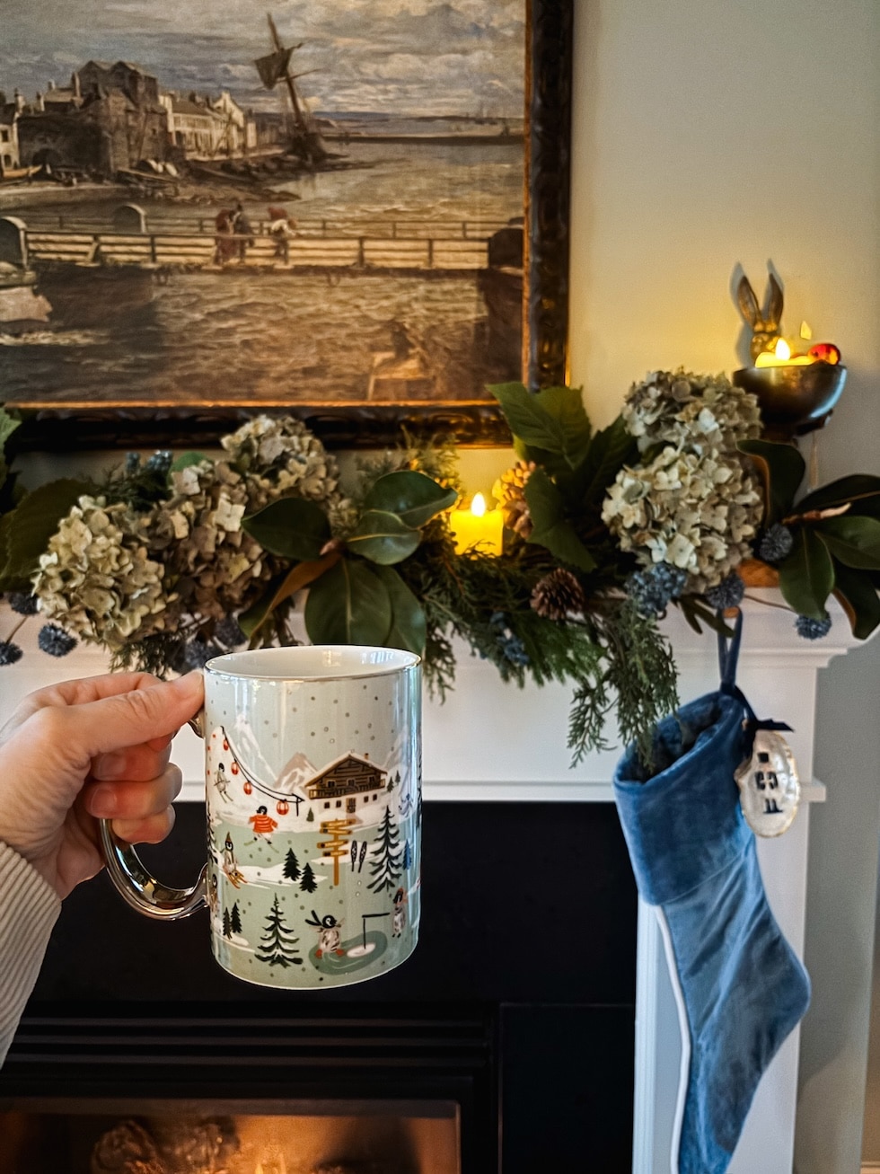I decided to bring our brass bunny and fox bowls over to the mantel and added copper string lights for extra glow. Our blue velvet stockings are hung now (it seems the dogs aren’t interested in them this year, so they are leaving them alone!). And I added these darling needlepoint Santa stockings we’ve had for years. I also hung our pretty painted shells with the stockings (not shown here but I’ll have the pics in my Christmas tour).