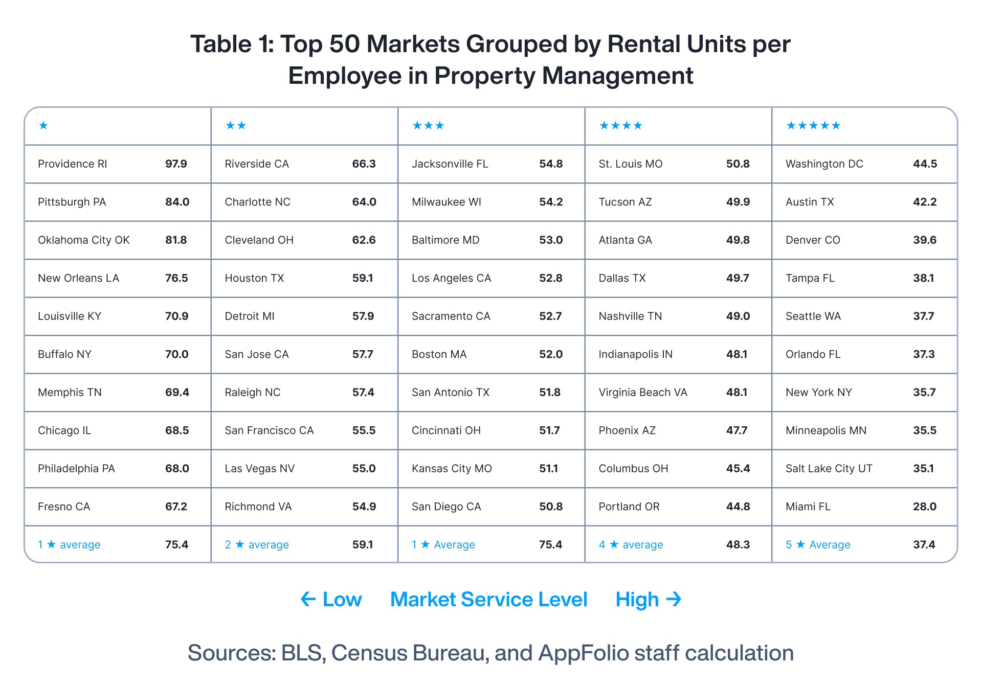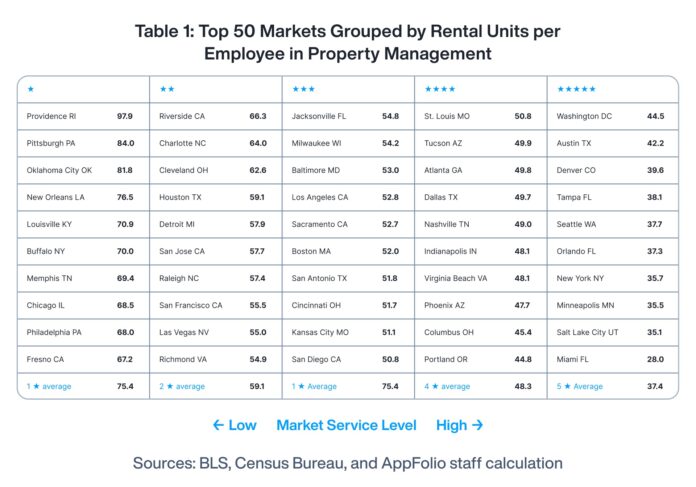 This market update analyzes how well property managers serve U.S. metro areas and the factors that influence this level of service. We use a star-rating system based on units per employee to define high-service and low-service markets, observing that higher service levels are associated with larger apartment complexes and increased domestic migration. Labor-saving technology offers new avenues for property managers to improve service in all markets.