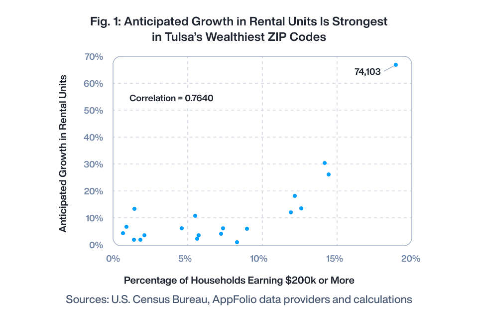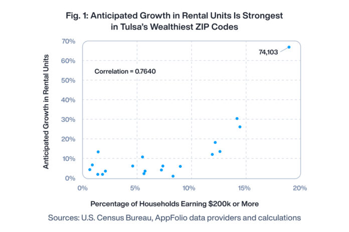 Tulsa is not the only metro area where we observe a positive correlation between the ZIP codes’ share of high-income earners and apartment growth. AppFolio repeated the analysis in Figure 1 for all 129 metro areas with at least 10 ZIP codes where data is available for both variables, and we summarize our results in Table 1. Nationwide, we find that positive correlations between household earnings and anticipated rental unit growth, as detected in Tulsa, are more than twice as common as negative correlations.