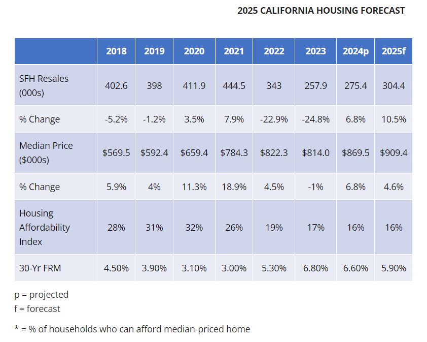 In tandem with sales growth, the median home price in California is set to rise to $909,400 in 2025. This represents a 4.6% increase from an estimated $869,500 in 2024. Although prices are continuing to climb, the rate of growth appears to be moderating, which should be welcome news for buyers contending with affordability constraints.