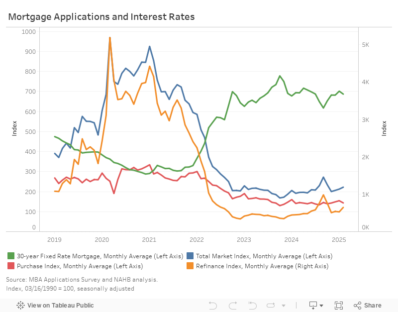 The average 30-year fixed rate mortgage reported in the MBA survey for February fell 15 basis points (bps) to 6.9% (index level 687), 7 bps lower than a year ago.