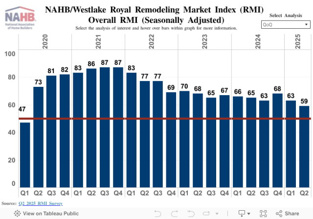 In the second quarter of 2025, the NAHB/Westlake Royal Remodeling Market Index (RMI) posted a reading of 59, down four points compared to the previous quarter. While this reading is still in positive territory, some remodelers, especially in the West, are seeing a slowing of activity in their markets. The second-quarter reading of 59 marks only the second time the RMI has dipped below 60 since the survey was revised in the first quarter of 2020.