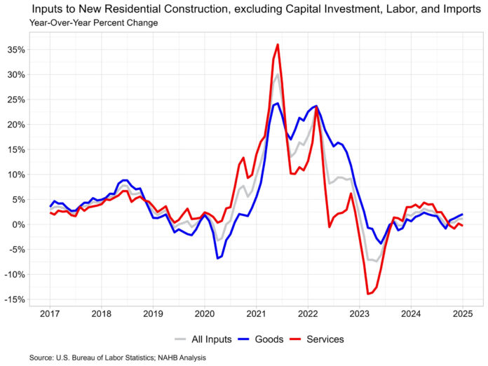 Prices for inputs to new residential construction—excluding capital investment, labor, and imports—were up 1.2% in January according to the most recent Producer Price Index (PPI) report published by the U.S. Bureau of Labor Statistics. The Producer Price Index measures prices that domestic producers receive for their goods and services, this differs from the Consumer Price Index which measures what consumers pay and includes both domestic products as well as imports.