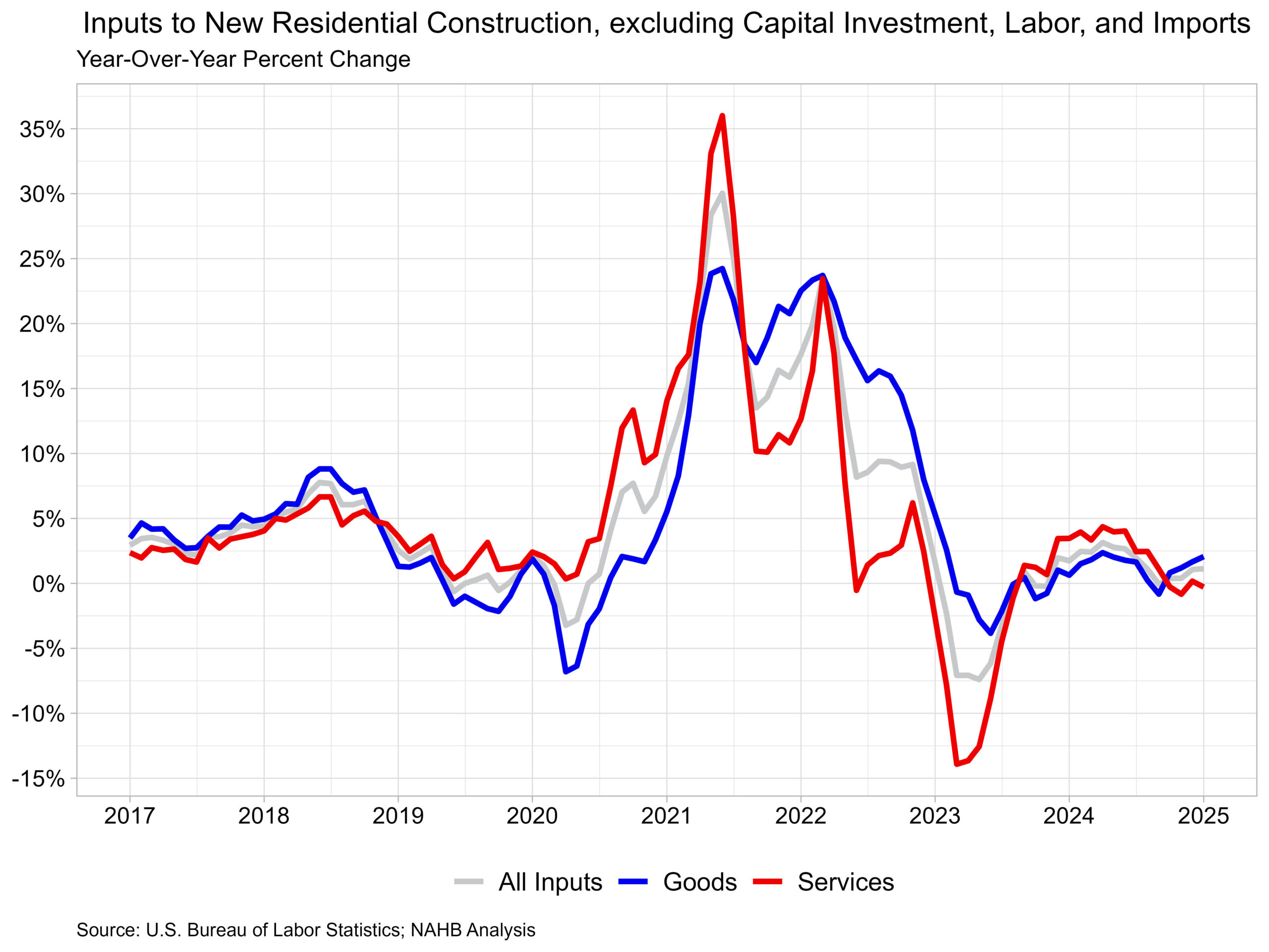 The inputs to the New Residential Construction Price Index grew 1.1% from January of last year. The index can be broken into two components—the goods component increased 2.1% over the year, while services decreased 0.3%. For comparison, the total final demand index, which measures all goods and services across the economy, increased 3.5% over the year, with final demand with respect to goods up 2.3% and final demand for services up 4.1% over the year.