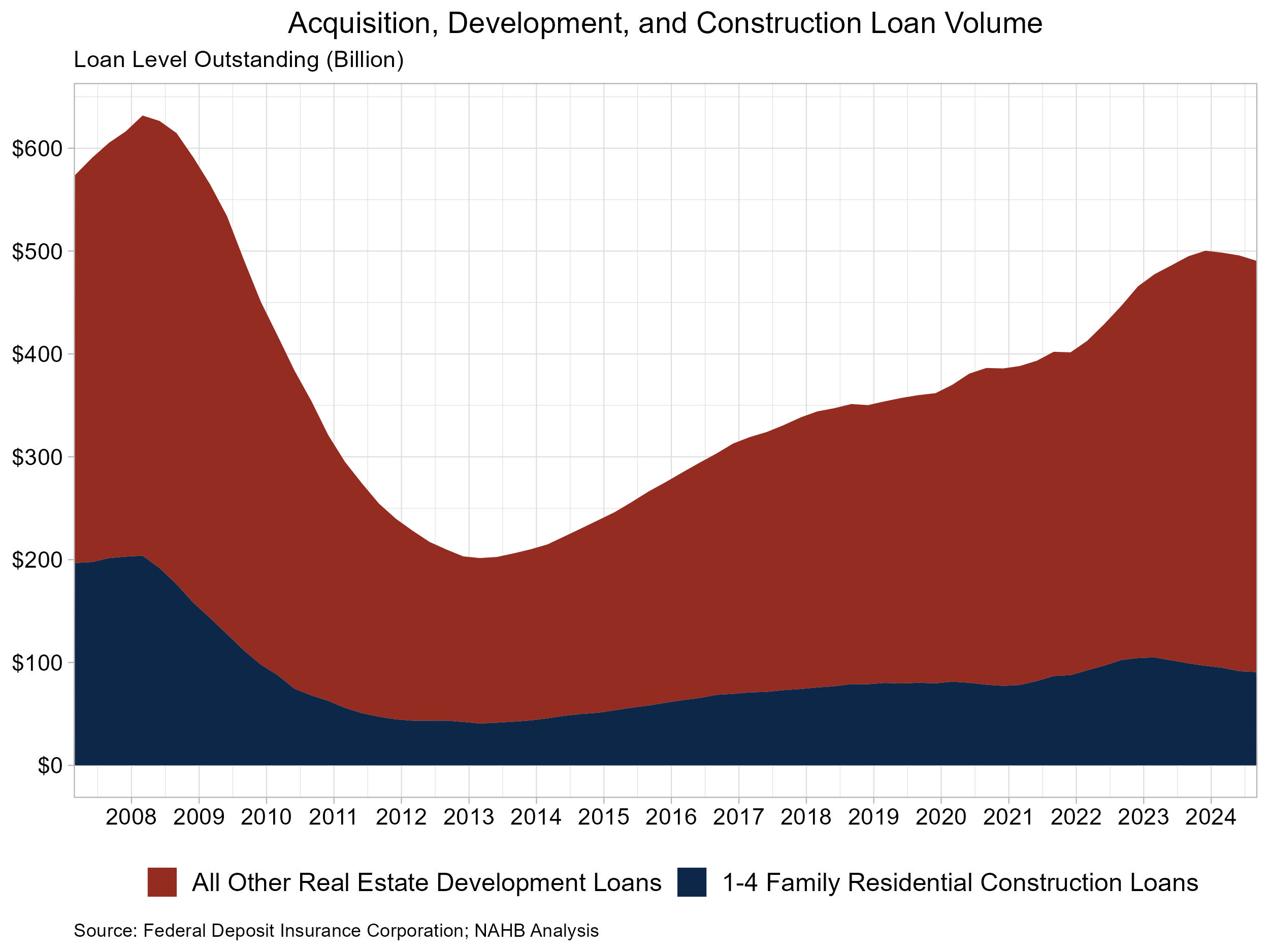 The total volume of outstanding acquisition, development, and construction (AD&C) loans made by FDIC-insured institutions fell for the third consecutive quarter during the third quarter of 2024 to a volume of $490.7 billion, down from $495.8 billion in the second quarter. Interest rates remained higher over the third quarter, as the Fed issued its first rate cut at the end of the quarter in September. Future AD&C lending conditions are poised to improve as the Fed continues its easing cycle over the next year despite potential headwinds of higher Government deficits and economic uncertainty.
