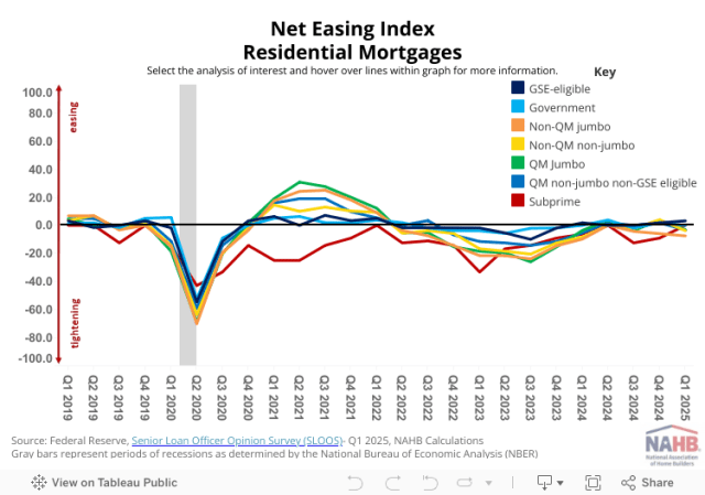In the first quarter of 2025, only one of seven residential mortgage loan categories saw a slight easing in lending conditions, as evidenced by a positive value for GSE-eligible loans, which was +3.2 in the first quarter of 2025. Subprime and government loans both recorded a neutral net easing index (i.e., 0) while the other four categories (Non-QM jumbo; Non-QM non-jumbo; QM non-jumbo, non-GSE-eligible; QM jumbo) were negative, representing tightening conditions. The Federal Reserve classifies any net easing index between -5 and +5 as “essentially unchanged,” however. By this definition, lending standards changed significantly for only one category of residential mortgages: non-QM jumbo (-7.5).