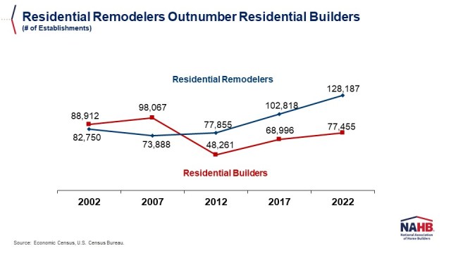 The number of residential remodelers in the U.S. has reached a record high of 128,187 establishments, 65% higher than the number of residential builders (single-family and multifamily), which stands at 77,455. These official government counts were released by the U.S. Census Bureau as part of its 2022 Economic Census, which tallies American businesses every five years (in years ending in 2 and 7).