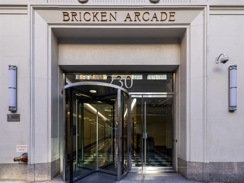 Located at 230 W. 38th St., The Bricken Arcade was completed in 1928. The mid-rise office building includes five passenger elevators, floorplates ranging from 6,500 square feet to 11,000 square feet, as well as 17,557 square feet of retail space, the same source indicates.