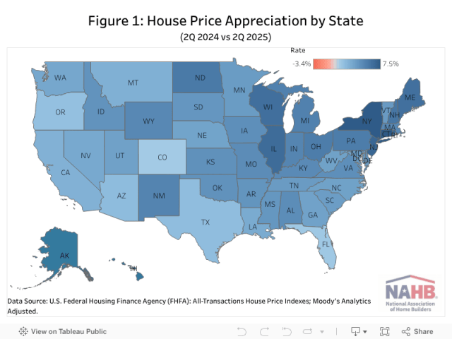 Between the second quarter of 2024 and the second quarter of 2025, all 50 states experienced positive year-over-year (YoY) house price appreciation, ranging from 0.9% to 7.5%. In contrast, the District of Columbia saw a 3.4% decline in house prices. Connecticut and New York led the nation with a 7.5% gain each, followed by Rhode Island with a 6.9% gain. On the opposite end, Colorado recorded the lowest house price appreciation at 0.9%. Out of all 50 states and the District of Columbia, 30 states exceeded the national YoY growth rate of 3.8%. However, on a quarterly basis, home price appreciation decelerated in 44 states and the District of Columbia compared to the first quarter of 2025, highlighting a broad-based deceleration in the housing market.