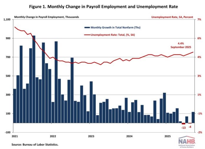 The September jobs report was delayed by more than six weeks due to the federal government shutdown. According to the long-awaited Employment Situation Summary reported by the Bureau of Labor Statistics (BLS), total nonfarm payroll employment rose by 119,000 in September, following a downwardly revised loss of 4,000 jobs in August. August’s growth was revised down by 26,000, from an initial estimate of +22,000 to -4,000, marking the second month of negative job growth since January 2010. July’s job growth was revised down by 7,000, from +79,000 to +72,000. Combined, the revisions erased 33,000 jobs from previously reported figures.
