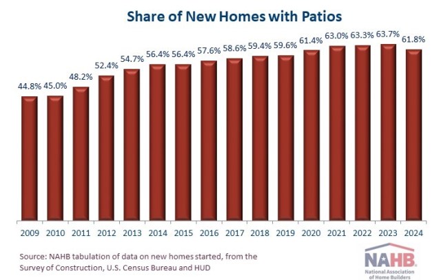 For the first time in 15 years, the share of new homes with patios finally declined in 2024, according to NAHB tabulation of data from the Survey of Construction (conducted by the U.S. Census Bureau with partial funding from the Department of Housing and Urban Development). Of the roughly 1.0 million single-family homes started during the year, 61.8% came with patios. This is down from 63.7% in 2024 and marks the lowest the percentage has been since 2020.