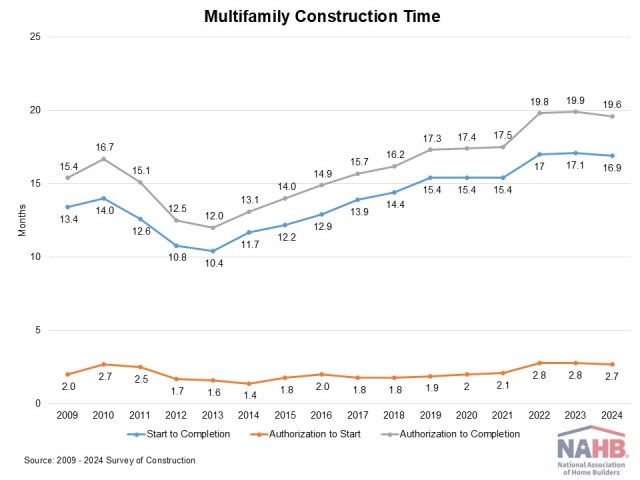 The average time needed to complete construction of a multifamily building after obtaining authorization edged down in 2024, according to the 2024 Survey of Construction (SOC) from the Census Bureau. On average, it took 19.6 months from permit to completion, about 0.3 months shorter than in 2023. While construction timelines remain lengthy, this modest decline occurred despite the industry continuing to grapple with a shortage of skilled labor.