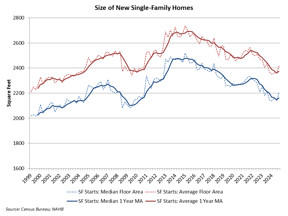 According to fourth quarter 2024 data from the Census Quarterly Starts and Completions by Purpose and Design and NAHB analysis, median single-family square floor area was 2,205 square feet, the highest reading since mid-2023. Average (mean) square footage for new single-family homes registered at 2,417 square feet.