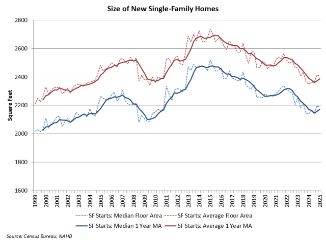 According to first quarter 2025 data from the Census Quarterly Starts and Completions by Purpose and Design and NAHB analysis, median single-family square floor area was 2,190 square feet, near the highest reading since mid-2023. Average (mean) square footage for new single-family homes registered at 2,408 square feet.