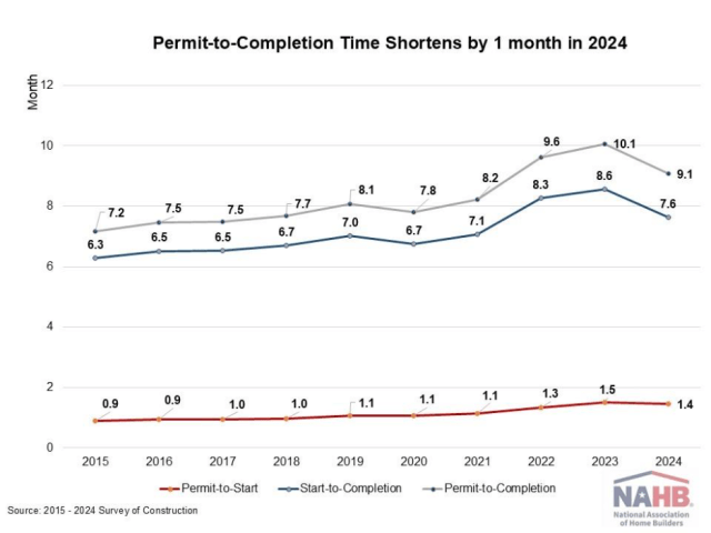Building a new single-family home took less time in 2024 compared to the previous two years. On average, it now takes 9.1 months from start to finish. That includes 1.4 months for authorization to start construction and another 7.6 months to finish construction. Data from the Census Bureau’s Survey of Construction shows that single-family construction timelines have shortened as supply chain challenges have eased after the pandemic. However, it is still almost two months longer than the average completion time in 2015. The extra time is largely attributable to a more stringent regulatory environment, elevated mortgage rates, and a shortage of skilled labor.