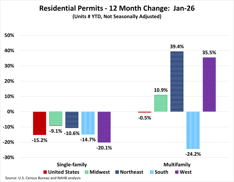 Regionally, year-to-date single-family permitting declined in all four regions in January. The Midwest declined by 9.1 percent, the Northeast fell 10.6 percent, the South declined 14.7 percent, and the West dropped 20.1 percent. Multifamily permits increased in three of the four regions, led by gains in the Northeast (up 39.4 percent), followed by the West (up 35.5 percent), and the Midwest (up 10.9 percent). The South saw a decline of 24.2 percent, driven largely by a 42.0 percent decrease in Atlanta-Sandy Springs-Roswell, GA metropolitan areas and a 39.0 percent drop in the Houston-Pasadena-The Woodlands, TX metropolitan area.