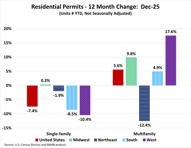 Regionally, year-to-date single-family permitting increased in only one of the four regions through December. The Midwest posted a slight gain of 0.3 percent, while activity declined in the Northeast (down 1.9 percent), the South (down 8.5 percent), and the West (down 10.4 percent). Multifamily permits increased in three of the four regions, led by gains in the West (up 17.6 percent), followed by the Midwest (up 9.8 percent), and then the South (up 4.9 percent). The Northeast saw a sharp decline of 12.4 percent, driven largely by a 21.0 percent drop in the New York–Newark–Jersey City metropolitan area.