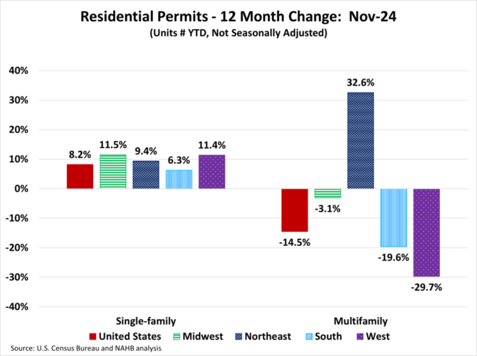 Year-to-date ending in November, the total number of multifamily permits issued nationwide reached 445,357. This is 14.5% below the November 2023 level of 520,919.