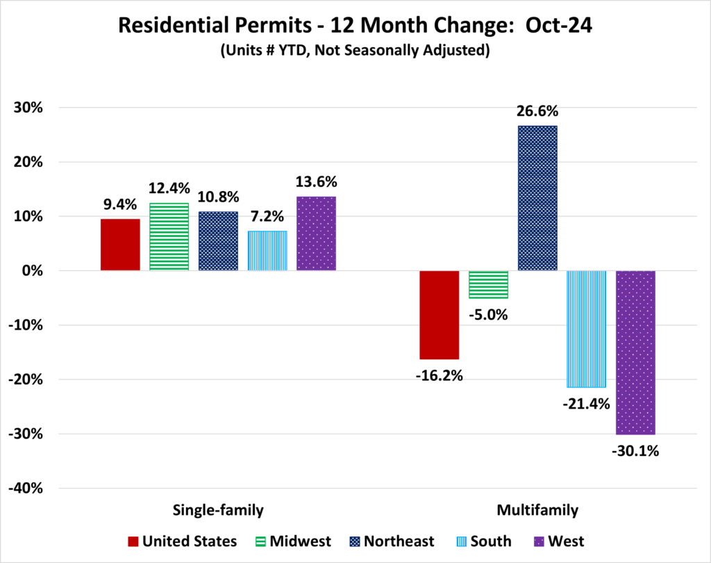 Year-to-date ending in October, the total number of multifamily permits issued nationwide reached 403,422. This is 16.2% below the October 2023 level of 481,612.