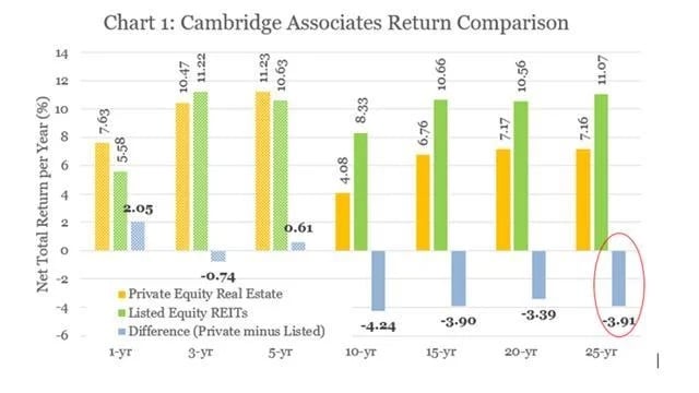 A study by Brad Case, CFA, PhD found that REITs are 17% less volatile than private real estate when the right adjustments are made for an apples-to-apples comparison.