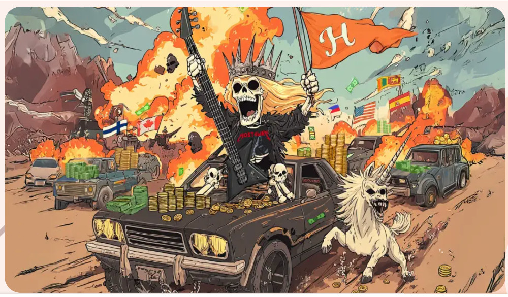 Picture this—Marcus as a crowned skeleton wielding a guitar, alongside a skull-faced unicorn, explosions in the background, and cars loaded with cash. Subtle? Not exactly. Effective? Absolutely.