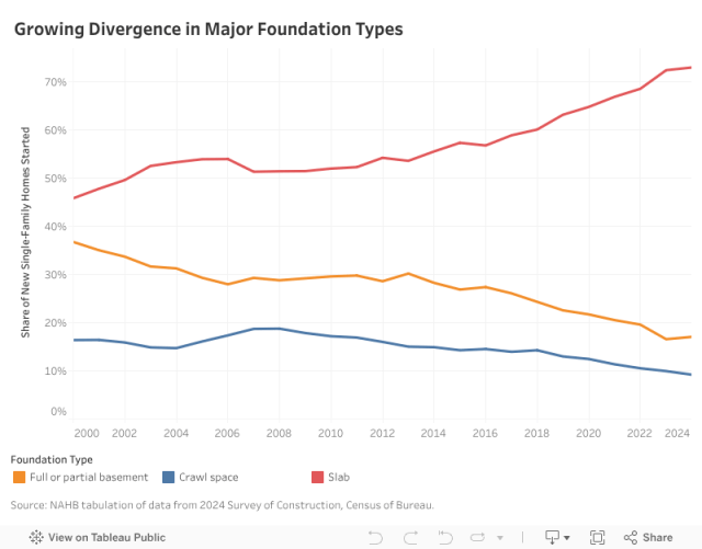 In 2024, 73% of new single-family homes started were built on slab foundations, according to NAHB analysis of the U.S. Census Bureau’s Survey of Construction (SOC). Although this was a modest year-over-year increase of 0.6 percentage points, it continues the upward trend in slab adoption, widening the gap between slabs and other foundation types. In comparison, basements (full or partial) accounted for 17% of new homes, while crawl spaces made up just 9.2%.