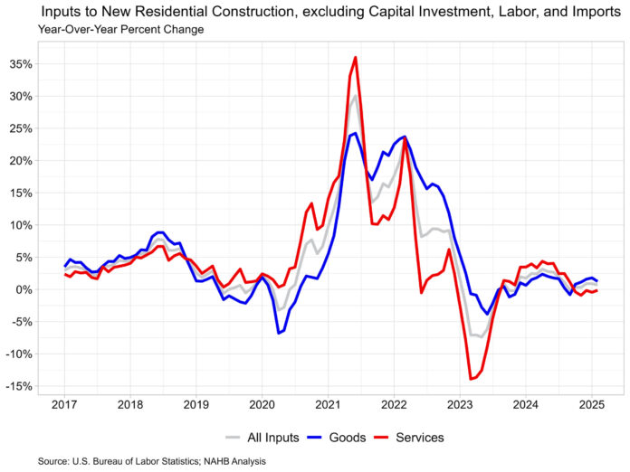 Prices for inputs to new residential construction—excluding capital investment, labor, and imports—were up 0.5% in February according to the most recent Producer Price Index (PPI) report published by the U.S. Bureau of Labor Statistics. The increase in January was revised downward to 1.1%. The Producer Price Index measures prices that domestic producers receive for their goods and services, this differs from the Consumer Price Index which measures what consumers pay and includes both domestic products as well as imports.