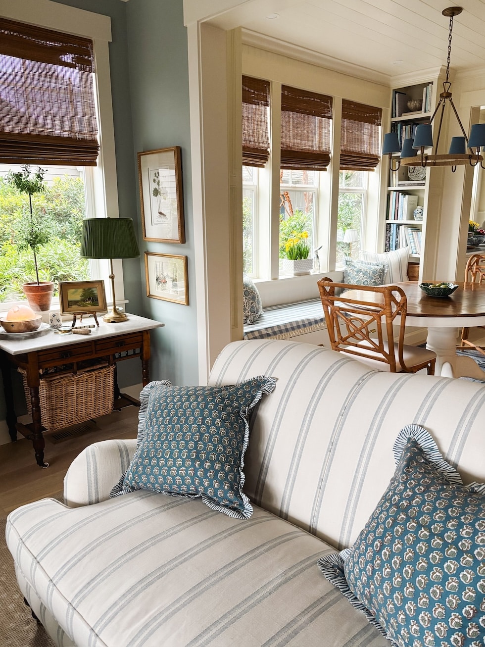 Bamboo Shades // Blue Block Print Pillow Cover // Striped Sofa (fabric options)