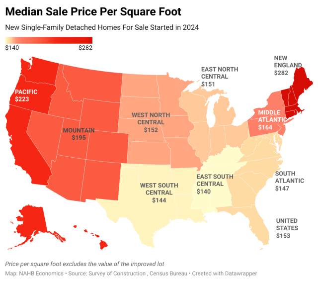 Median square foot prices for new single-family detached (SFD) homes started in 2024 grew modestly, according to NAHB’s analysis of the latest Survey of Construction (SOC) data. For custom, or contractor-built, homes, the median price was $166 per square foot of floor space, up slightly from $162 in 2023. For spec starts, after excluding record-high improved lot values, the median was $153 per square foot of floor area, inching up from $150 a year earlier. There is still notable regional variation in square footage prices. In New England, after excluding lot values, half of the spec homes started in 2024 had prices exceeding $282 per square foot. In the East South Central division, the median was $133, representing the most affordable prices per square foot.