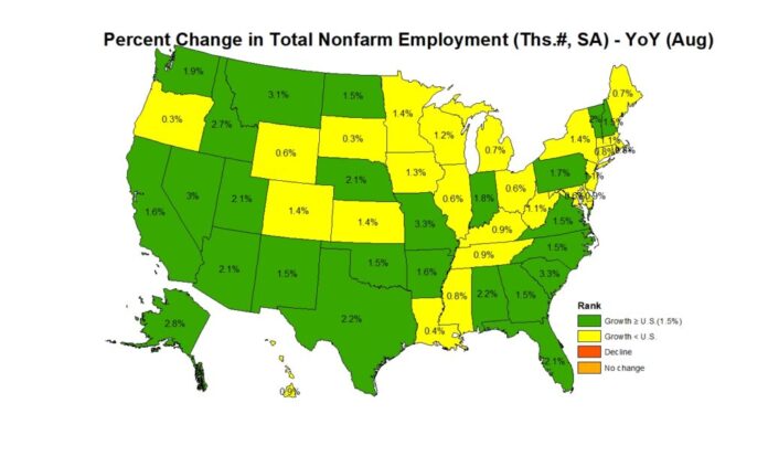 Year-over-year ending in August, 2.4 million jobs have been added to the labor market across all 50 states and the District of Columbia. The range of job gains spanned from 1,500 jobs in South Dakota to 302,400 jobs in Texas. In percentage terms, the range of job growth spanned 3.3% in Missouri to 0.3% in South Dakota.