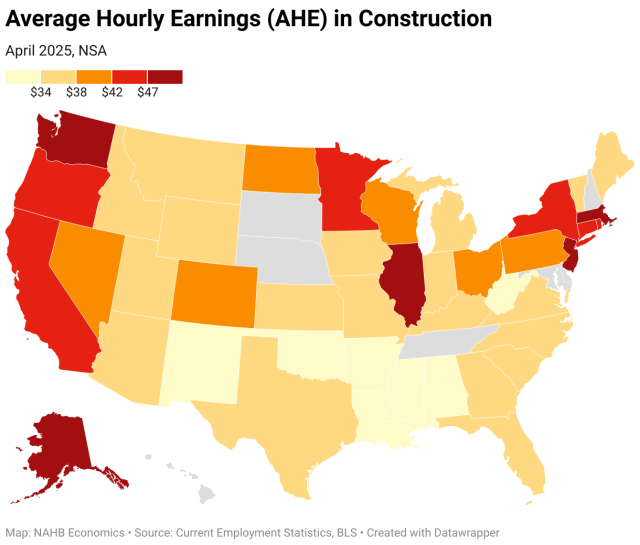 Average hourly earnings (AHE) in construction vary greatly across 43 states that report these data. Alaska, states along the Pacific coast, Illinois, Minnesota, and the majority of states in Northeast record the highest AHE. As of April 2025, fourteen states report average earnings (NSA) exceeding $40 per hour.