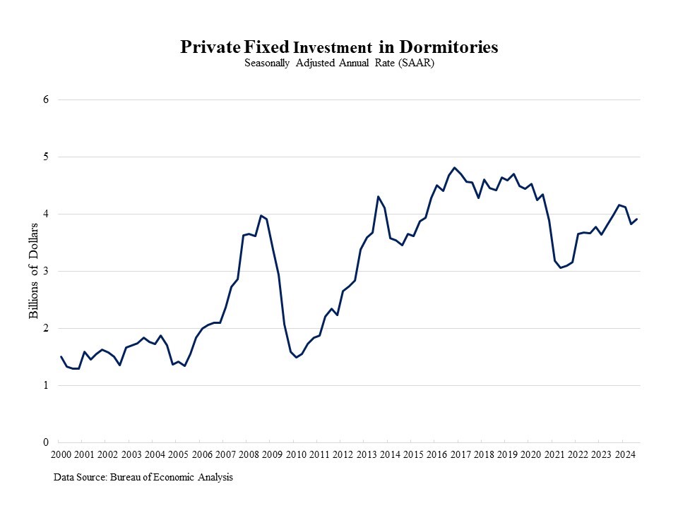 Private fixed investment in student dormitories increased by 2.2% to a seasonally adjusted annual rate (SAAR) of $3.9 billion in the third quarter of 2024. This rise follows a 7% decrease in the prior quarter. However, private fixed investment in dorms was 1.8% lower than a year ago, as the elevated interest rates place a damper on student housing construction.