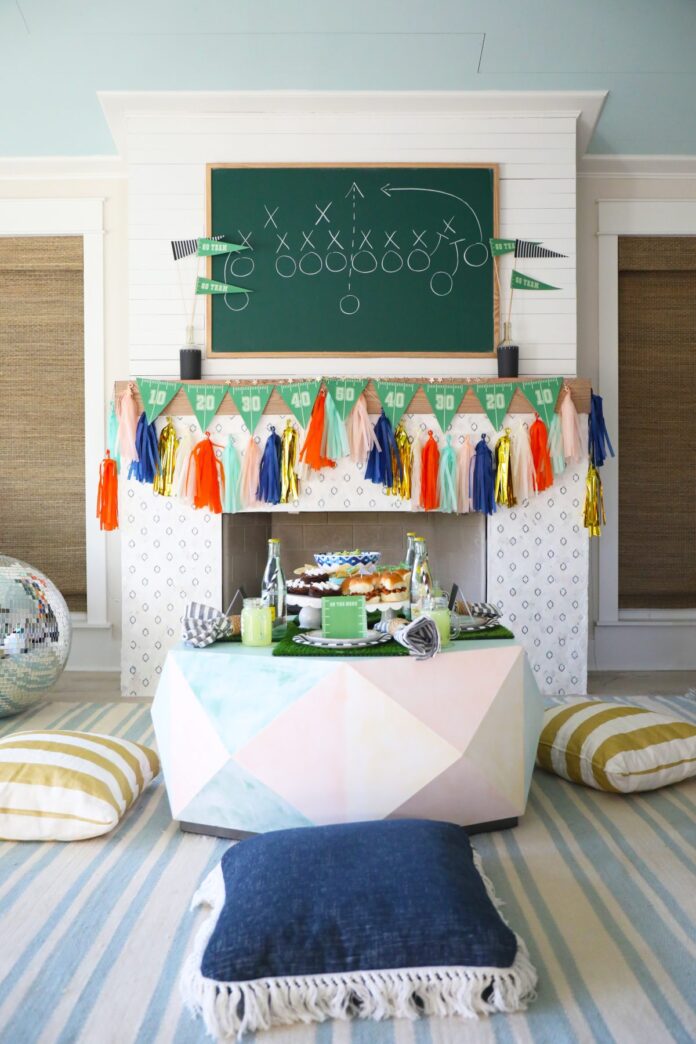 I pulled together our little coffee table with treats on the mantel. No worries, though, because that chalkboard {complete with an old-school football play} will move to make way for the TV behind it for the actual game.