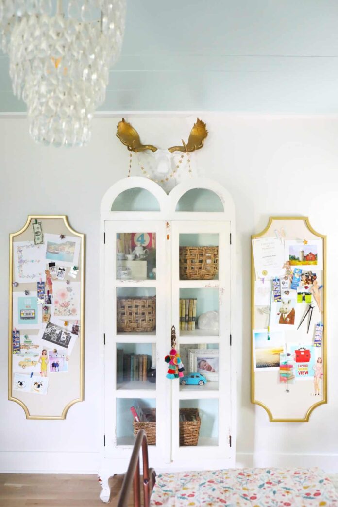And in this room, we added a board as well. Her dad made this little mantel on the other side of her room, and we added a board to the underneath side. She can collect art, photos and more!