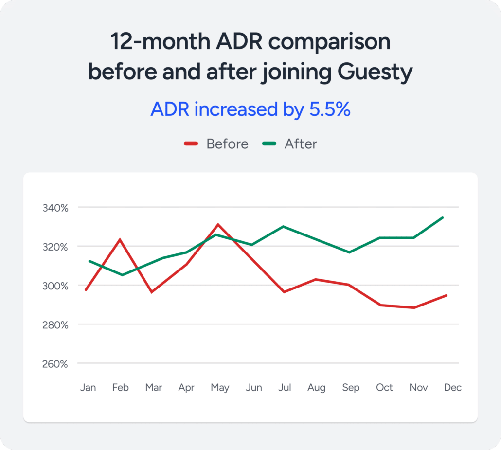 Boosting revenue potential: In the first 12 months after joining Guesty, our research group saw their average daily rate (ADR) increase by +5.5%, during the same period that industry benchmarks recorded an overall -6% ADR drop. Guesty’s AI-powered pricing tools optimize daily rates by balancing guest appeal and manager profitability, using real-time market insights. In an increasingly competitive market, strategic pricing intelligence and optimization tools are key to offering the best rates to maximize both ADR and occupancy.